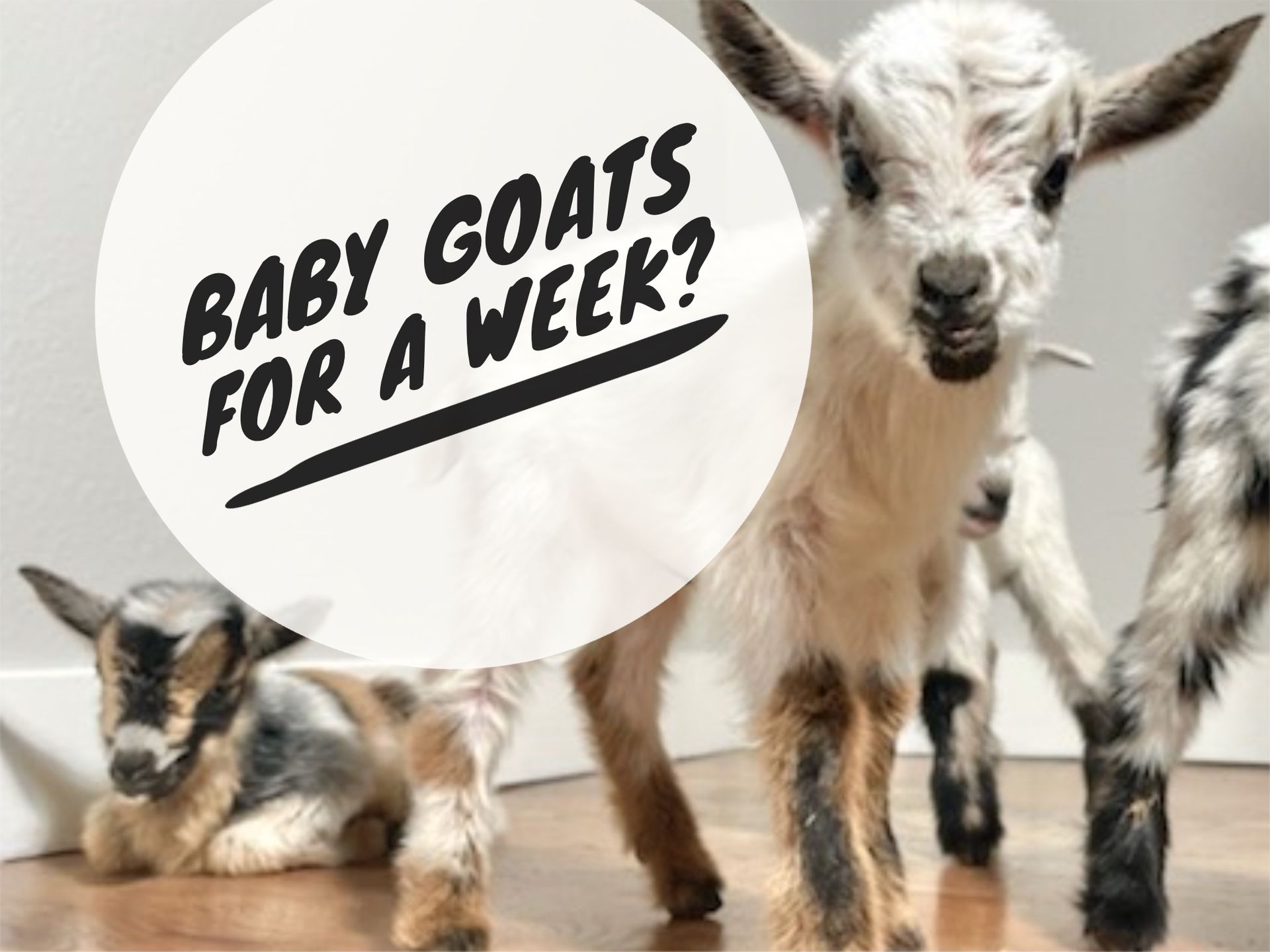 Here are some frequently asked questions. Multiples? They are herd animals so do much better in 2’s and 3’s. So we can set you up with two or three to go home. What do they eat? They are still on bottles. We will provide a bottle for each baby goat that needs to be rinsed out after each use and sanitized (run through the dishwasher) every day. They are also starting to eat grain and hay. We’ll provide both grain and hay for you to put out for them to graze if you provide the milk. Just store bought whole cows milk. Depending on the age of the goats you bring home they are drinking 2 to 3 16oz bottles a day. How do I feed them? When you prepare their bottles the milk needs to be warmed up so it’s not refrigerator cold. These babies are older and hardier so they don’t need the milk too warm just not cold. It’s fine to microwave the milk in the bottles or heat it up on the stove in a pot. Just make sure there are no hot spots. The microwave will heat the top but not the bottom so I gently shake the bottle around afterwards. Where do they sleep? We’ll bring a large dog crate for them to sleep in. You can put them inside or outside as long as it’s out of the wind and rain. You can also put them in a laundry room or bathroom so you can turn the lights out and close the door when it’s night time. Are they noisy? Yes, they can be. Bottle babies will squawk and cry when they are hungry. If they see you coming with a bottle they will start making lots of excited noises. But most of the time they don't make any noise. Can they run around the house? Yes, absolutely. We play with ours in the house where we have hardwood floors and can clean up. I also keep a close eye on them and when they stop and start squatting I run them outside or be ready to clean up real quick. Some people put baby diapers on them to avoid messes all together. I’ve never done that. Can I put them in my yard? Make sure you have a secured area. Goats are very tiny and can squeeze through most fences. Test this out to make sure they can be contained. Small dog or baby fencing works great to secure a smaller area within your yard for them.